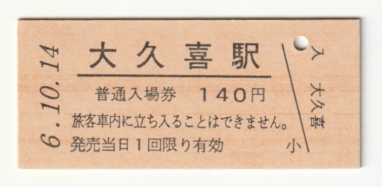 - 平成6年10月14日 八戸線 大久喜駅 140円硬券普通入場券(日付印刷)