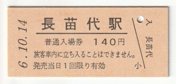 - 平成6年10月14日 八戸線 長苗代駅 140円硬券普通入場券(日付印刷)