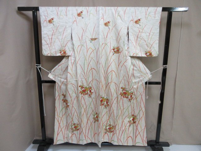 - 1円 良品 訪問着 正絹 着物 縮緬 式典 和装 和服 葦 草花 花車 扇子 高級 袷 身丈155cm 裄65cm【夢職】★