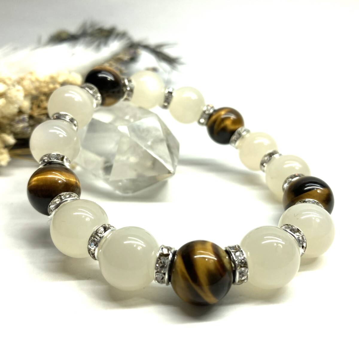> ムーンストーン&タイガーアイ パワーストーン ブレスレット 天然石ブレス (シルバー) 12mm 幸運 開運 メンズ 男性♪