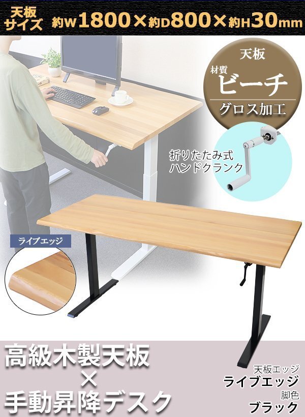 > 送料無料 昇降デスク 手動 W1800×D800×H735~1185mm ビーチ材 ライブエッジ 脚色 ブラック 木製 天板 グロス加工 耐荷重約70kg(脚部)
