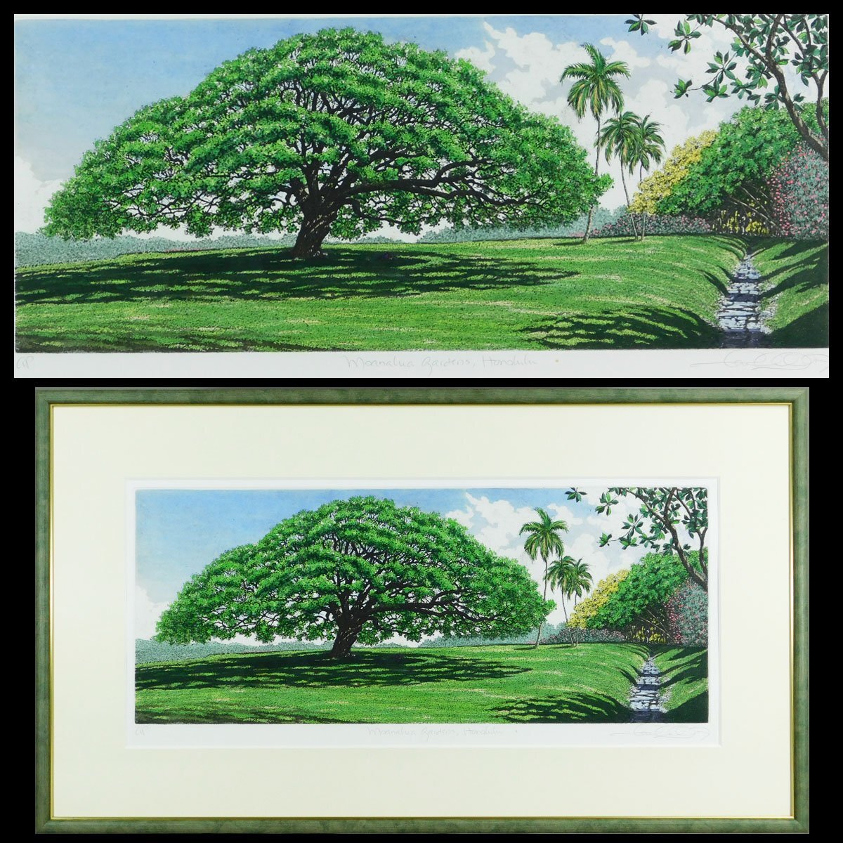 > キャロルコレットCarol Collette「MOANALUA GARDEN」銅版画(エッチング)額装 手彩 リアリズム 証明シール 横長大判 美品 ka2511N05