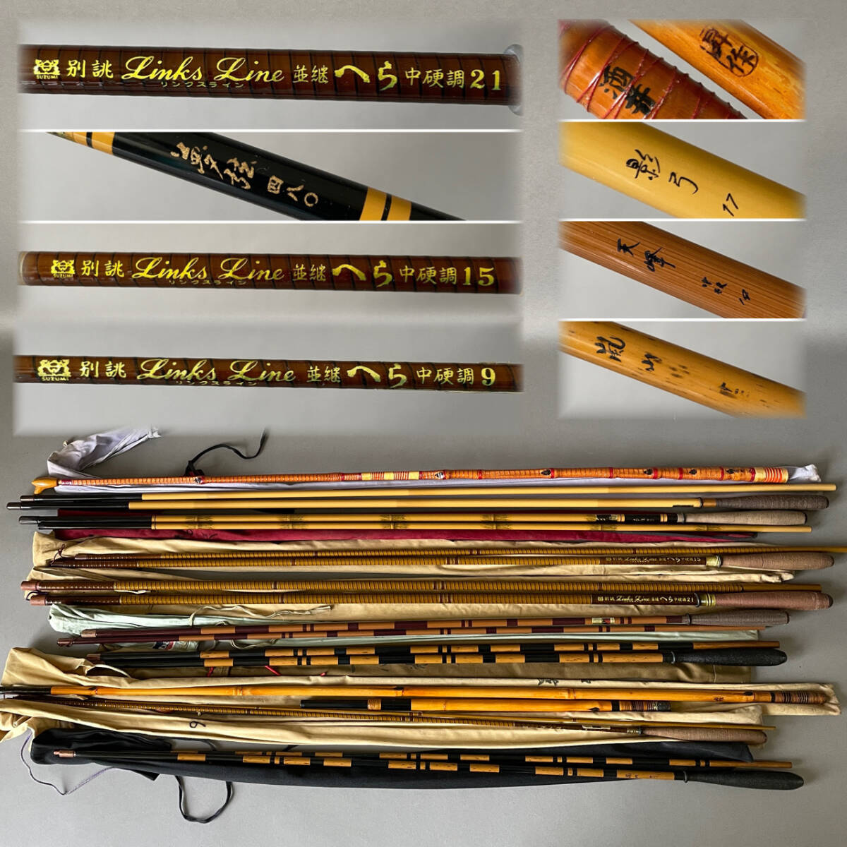 - MS3570 在銘あり 和竿 ヘラ竿 竿掛け 10点 まとめて 嵐山 天峰 夢弦 影弓 昇作 酒井 別誂リンクスラインなど (検)へらぶな 釣具 竹