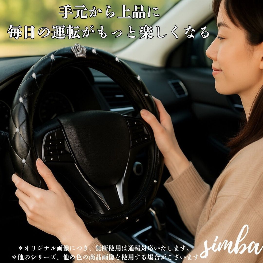 - 【高級感×可愛さ】ハンドルカバー 王冠 ラインストーン PUレザー 38cm O型 軽自動車/普通車対応 キルティング 汎用 ブラック