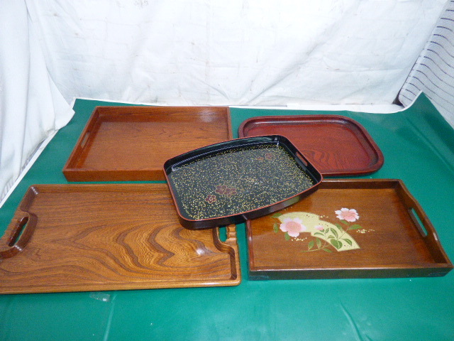- む808.【5点セット】お盆 若狭塗 木製 天然木 漆器 お運び 手長盆