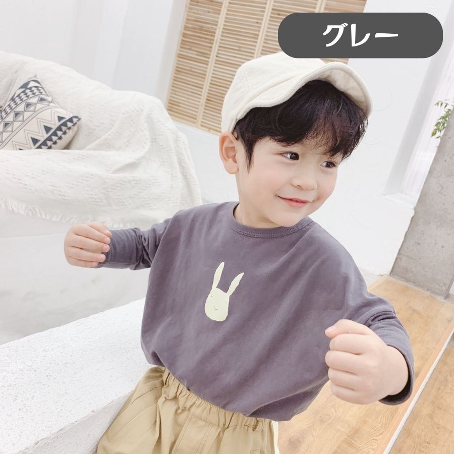 - グレー 130cm うさぎ柄 ドロップショルダー 長袖 Tシャツ 綿キッズ 男の子 女の子 子供服 部屋着 可愛い 春夏秋冬