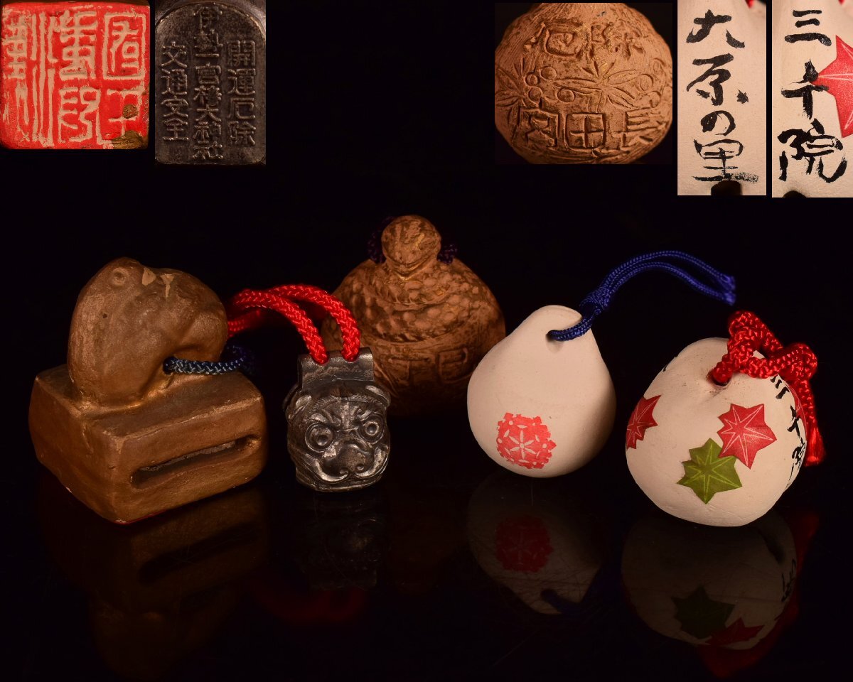 X257 【泉美】郷土玩具 巳 伊勢一宮 椿大神社 三千院 大原の里 時代 神鈴 土鈴 鈴 魔除け 神社 置物 オブジェ 飾り ストラップ 5点拍卖