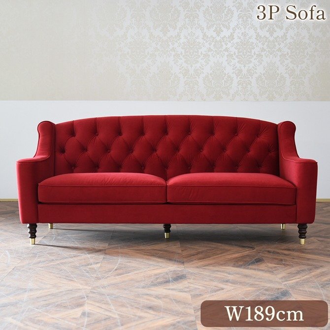 > 【アウトレット】330,000円 3人掛けソファ ロワイヤル ルージュ 3P ベルベット レッド 幅189cm 輸入家具 クラシック ヨーロピアン 高級