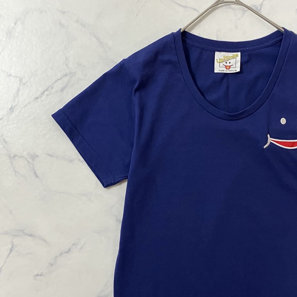 > 美品 UP Smille アップスマイル ロゴ 刺繍 ポケット 半袖 Tシャツ ブルー ホワイト レッド M