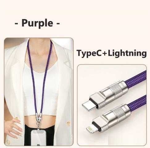 - スマホネックストラップ パープル 90cm 充電ケーブル 2in1 TypeC + Lightning 充電コード
