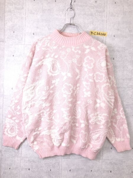 - JENNIFER ADAMS レディース USA製 総柄 ニットセーター ピンク白シルバー