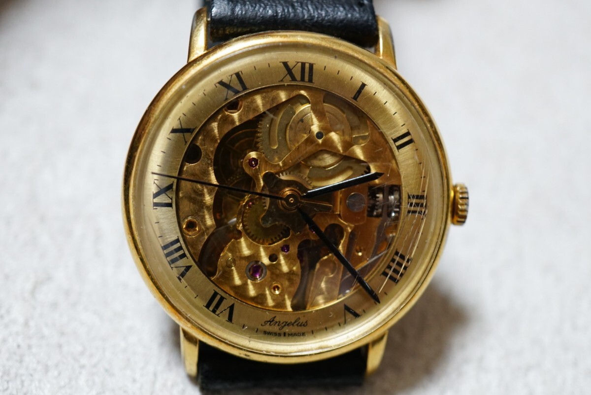 - F2135 稼動品 Angelus スケルトン SWISS 手巻き ゴールドカラー メンズ 腕時計 アクセサリー ヴィンテージ ブランド 訳あり ベルト破損