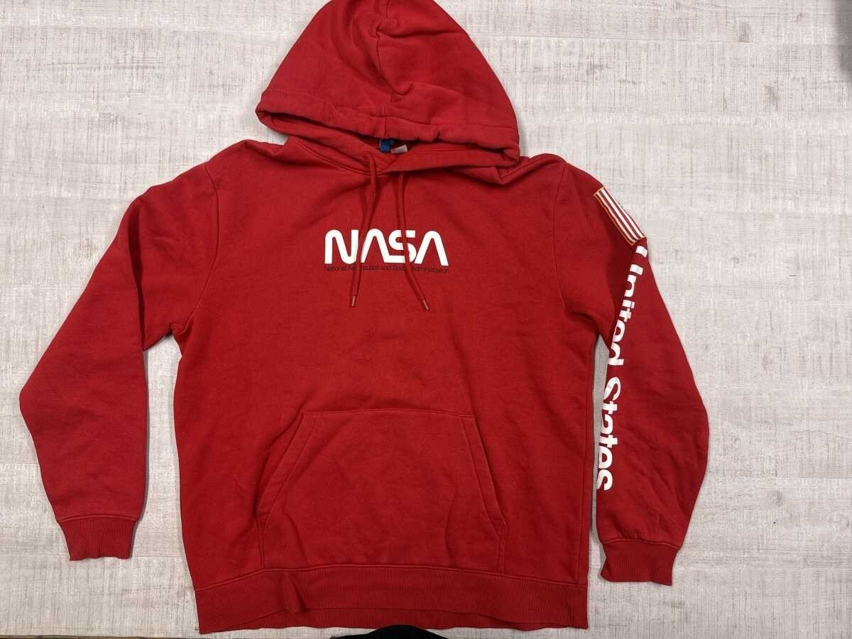 - エイチアンドエム H&M ナサ NASA コラボ アメカジ ストリート 袖プリント 宇宙 スペース スウェット フーディー パーカー メンズ L 赤