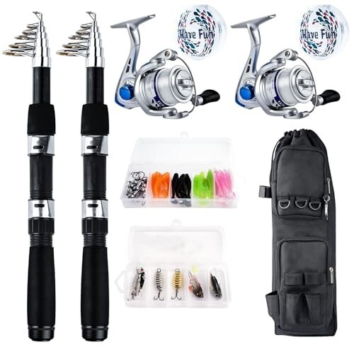 - テレスコロッド2.1m 3000番リール2台セット 仕舞43cm 海淡両用 ルアー/バッグ付 旅行向け