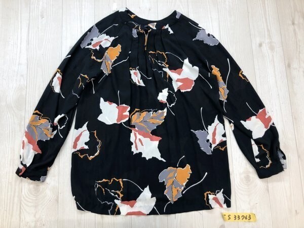 - レディース バンドカラー 総柄 ピンタック ブラウス 紺