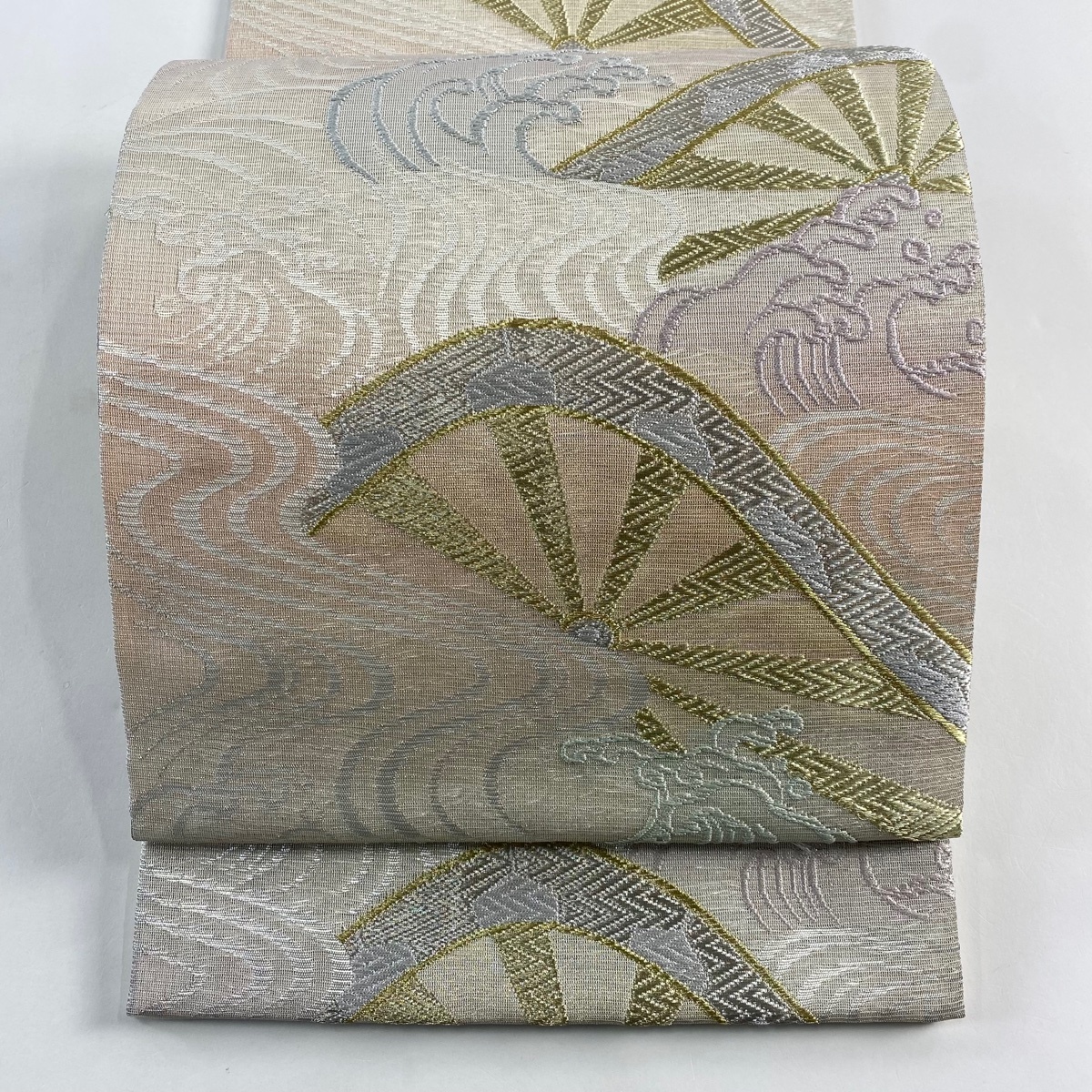 > 袋帯 名品 夏帯 片輪車 波 金銀糸 箔 薄オレンジ 六通 正絹 【中古】