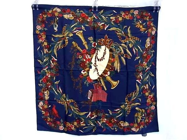 - ■美品■ COACH コーチ シルク100% フラワー 花 スカーフ ストール ショール レディース ネイビー系×マルチカラー DJ5613
