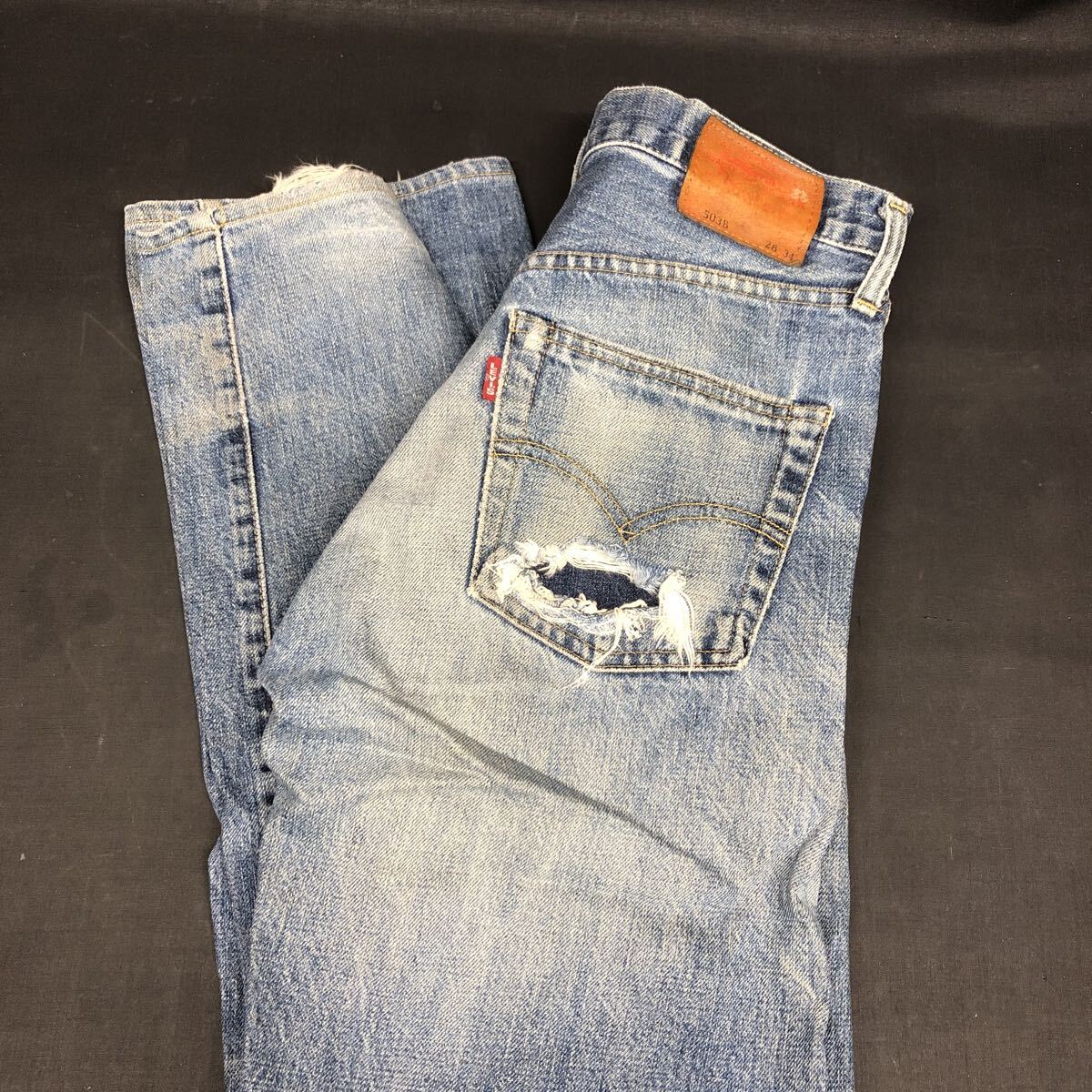 > Y2440 【 Levi’s 503B XX 革パッチ 】 デニム リーバイス 28 34 日本製 古着 ユーズド ジーパン Gパン ダメージ 赤耳