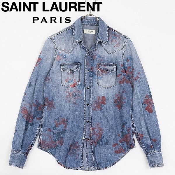 > 【HA947】イタリア製◆Saint Laurent サンローラン 花柄 デニム 長袖 ウエスタン シャツ インディゴブルー M