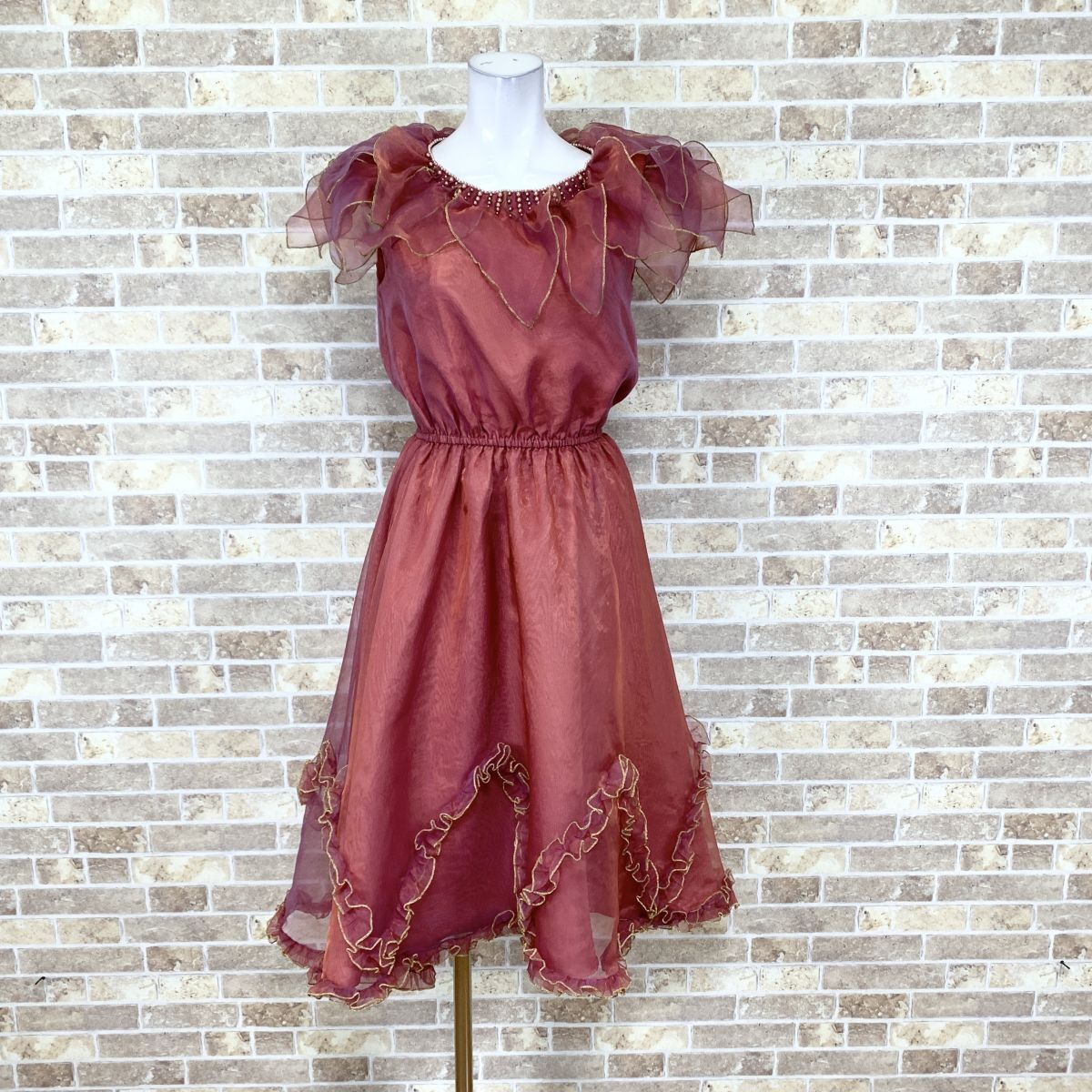 - 1円 ドレス ロングワンピース ピンク系光沢 肩パット カラードレス ロリータファッション 発表会 イベント 中古16100