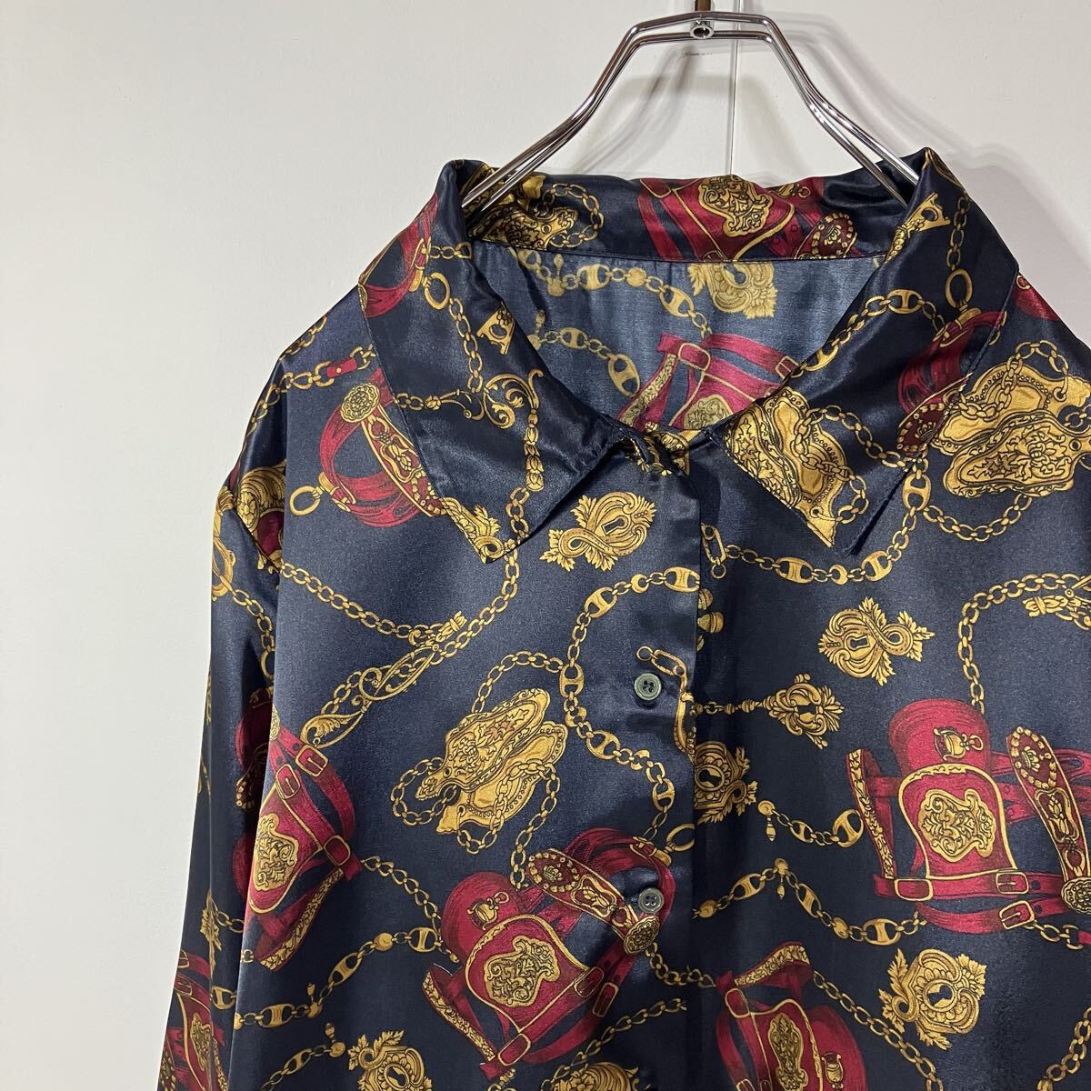 - スカーフ柄 スクエアカット ポリ 長袖 シャツ 大きいサイズ 古着 ネイビー 5L