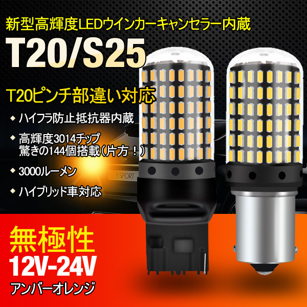 > ハイフラ防止抵抗内蔵 t20 s25 シングル ピン違い 角度違い 144LEDチップ 爆光 LED ウインカー ホワイト イエロー アンバー