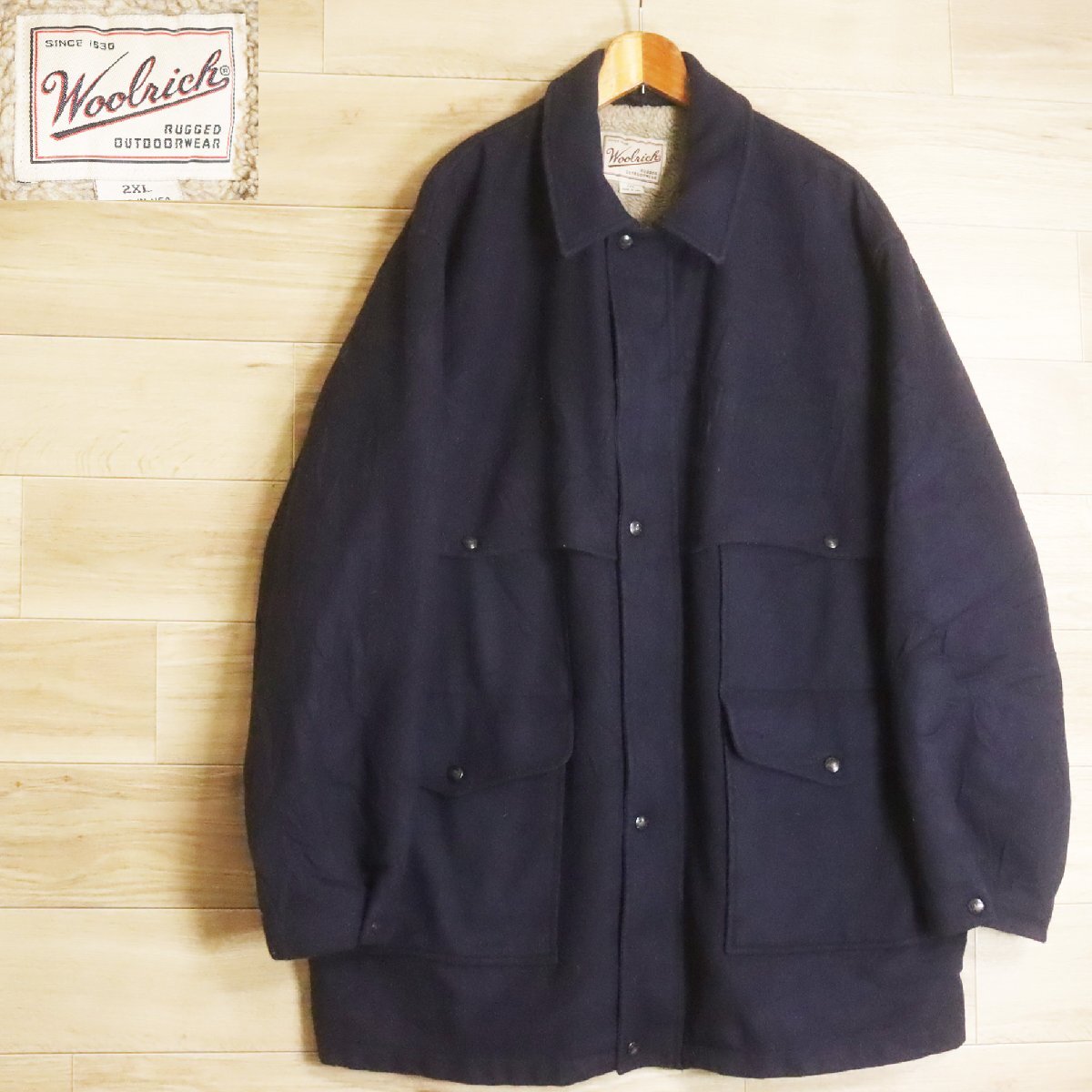 > B7S/O5.2-4 USA製 Woolrich ウールリッチ マッキノーウール クルーザージャケット 裏ボア ハーフコート 2XL ネイビー 古着