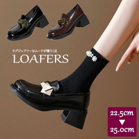 > レディース ローファー パンプス スクエアトゥ 金具 厚底 黒 ブラウン 美脚 脚長 太ヒール 22.5cm(35) 黒
