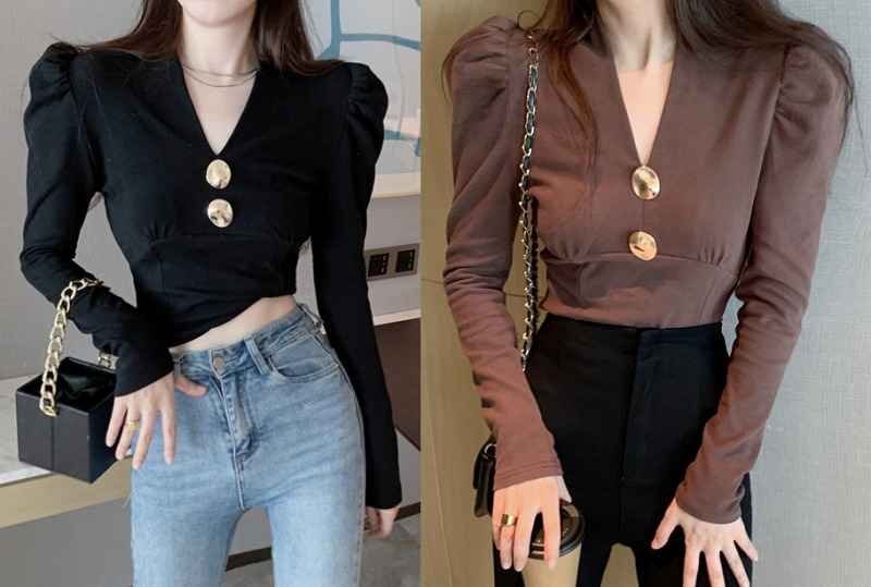 - 全2色 長袖トップス Vネック シャーリング 切り替え スリム 着痩せ シンプル フリー ブラウン