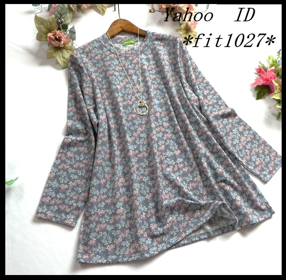 - 送料無料・3~4L【新品】可愛いお花柄♪カットソー素材で伸縮OK★ほんのりAラインチュニック◇ブルーG◆fit1027◆大きいサイズ