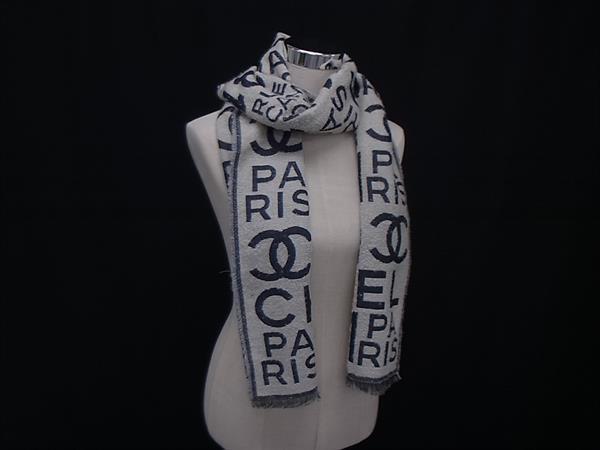 - 1円 CHANEL シャネル バイシーライン カシミヤ×シルク フリンジ マフラー ストール 防寒具 レディース ネイビー系×アイボリー系 FU5603