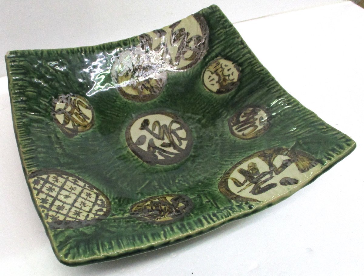 - 角大皿 盛鉢 福寿 武市エ門 織部焼 幅34x奥行き34x高さ7.5cm 角欠有 中古 102034 ☆
