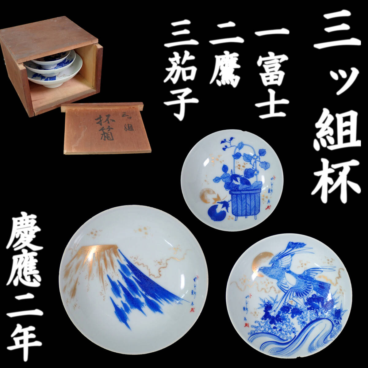 - 1866年 幕末 慶應二年 金彩 三ッ組杯 青白磁 色絵杯 一富士二鷹三茄子 当時物