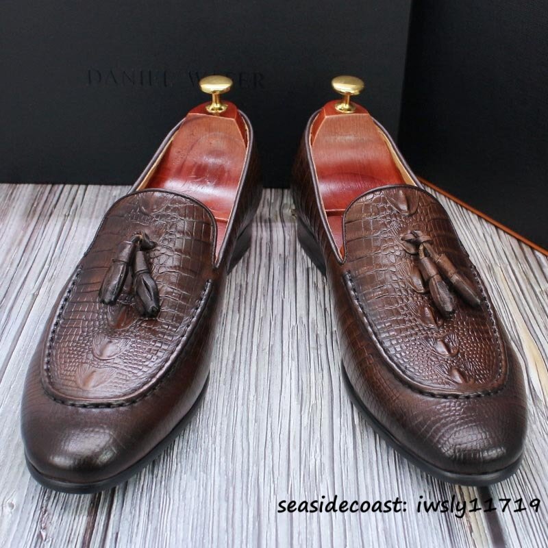 - 定価10万超★最高級 メンズシューズ 鰐柄 職人手作り ビジネスシューズ 本革レザーシューズ タッセルローファー 牛革 革靴 ブラウン 27.5cm