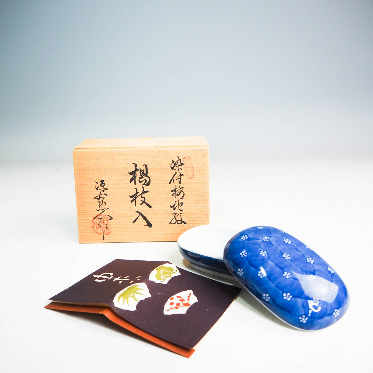> 有田焼 館林源右衛門 作 染付梅地紋 楊枝入 蓋物 共箱 爪楊枝入れ 小物入れ 陶芸 伝統工芸 S1827