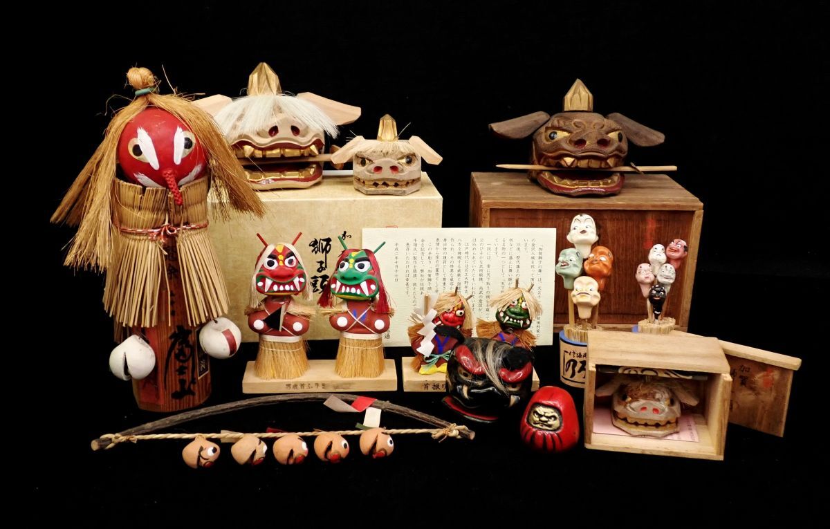 - ▲郷土玩具まとめて14▲三階千嶺/共箱/魔除け/なまはげ/金剛鈴/首人形/鬼/佐渡/のろま人形/甲州弓張鈴/獅子頭/民芸品/お土産/消費税0円