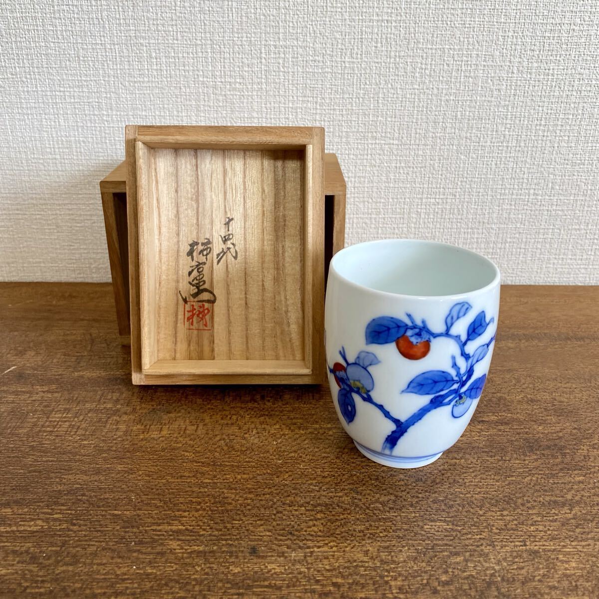 - 十四代 酒井田柿右衛門 染錦 柿文 湯呑 / 人間国宝 有田焼 共箱付き 色絵 湯呑み