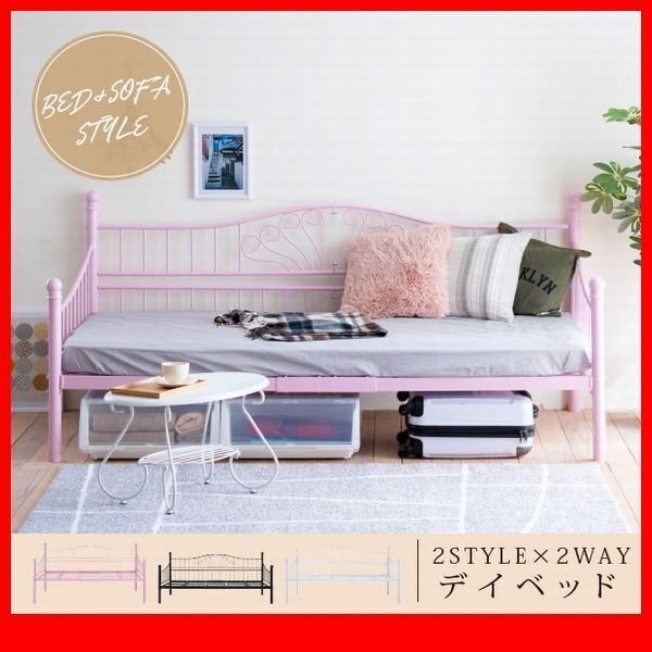 - ベッド★ロートアイアン デイベッド シングル フレーム/パイプベッド ソファベッド ハイ&ロー 高さ調節 床下収納/黒 ピンク 白/zz