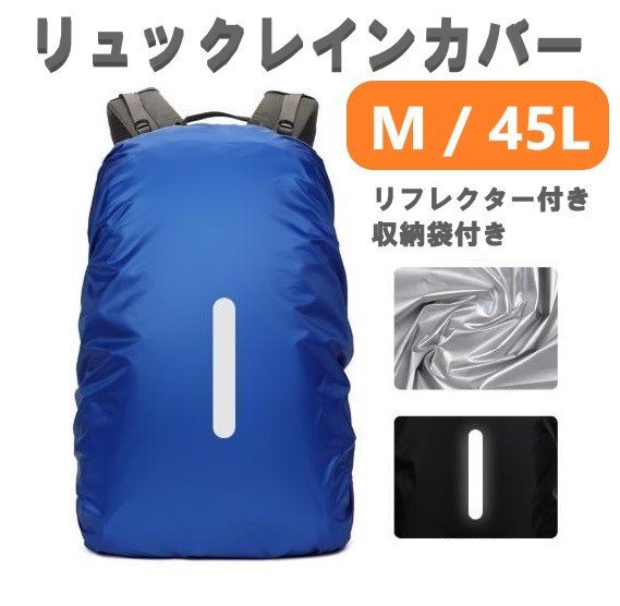 > レインカバー ブルー Mサイズ 45L 落下防止バンド付き 収納ポーチ付き リュックカバー ザックカバー 防水 雨 雨用 バッグ