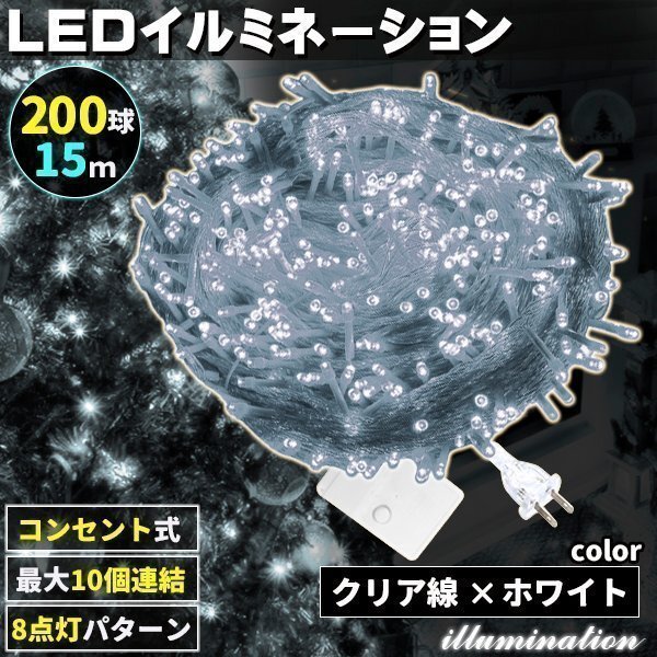 - AC式 イルミネーション コンセント 連結可 LED イルミネーションライト ツリー ライト 200球 200灯 15m 透明線 ホワイト