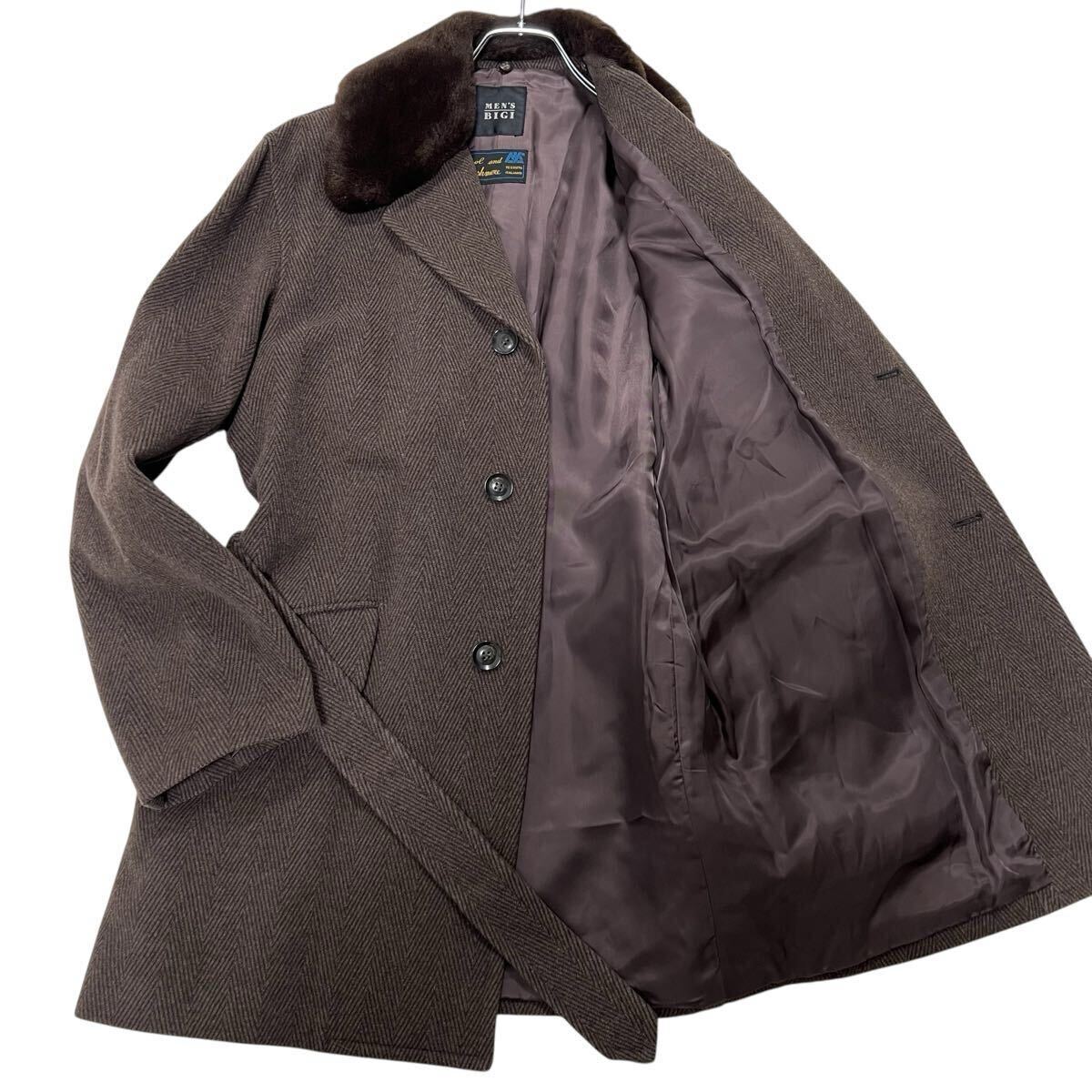 > メンズビギ ウールカシミア ベルト付チェスターコート L ブラウン ファー取り外し可 ヘリンボーン イタリア生地 冬 MEN'S BIGI TESSUTO 1円