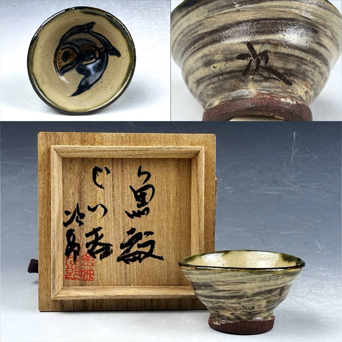 - 沖縄壺屋焼 人間国宝 金城次郎 色絵 刷毛目 魚文刻 ぐい 盃 酒杯 無傷 共箱 酒器 茶道具 和食器 古陶磁器 古美術骨董品 BNT208【遅日亭】