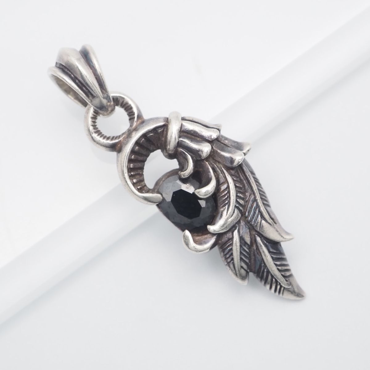 - H380 オニキス 925刻印 ペンダント トップ 羽 フェザー デザイン シルバー チャーム ヘッド ヴィンテージ