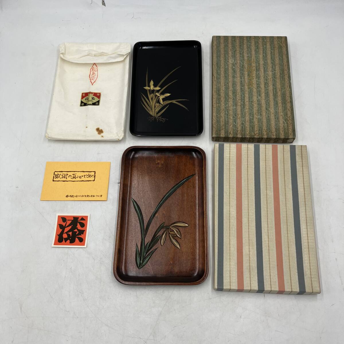 【長期保管品】盆 漆器 2点 長方形 (黒)輪島塗/(茶)切手盆ラン 元箱あり トレー インテリア 置物 昭和レトロ