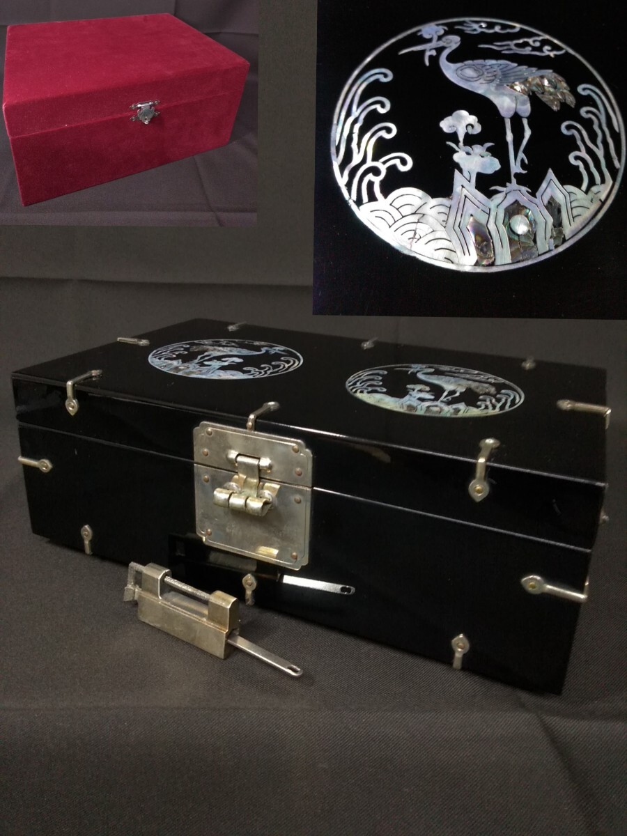 > 朝鮮螺鈿細工 双鶴 黒漆塗 四方箱 宝石箱 小物入れ 漆工 漆芸 美術品 唐物 (検索) 骨董 古玩 漆塗 アンティーク 貝細工 螺鈿 伝統工芸 時代