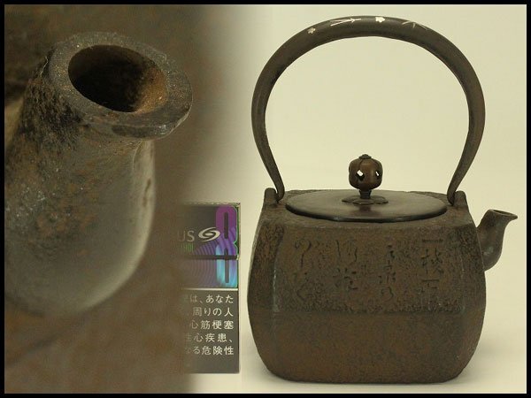 - 【銀閣】四方 在銘 持ち手 銀象嵌 鉄瓶 未使用 時代物 旧家蔵出 送料無料(A677)