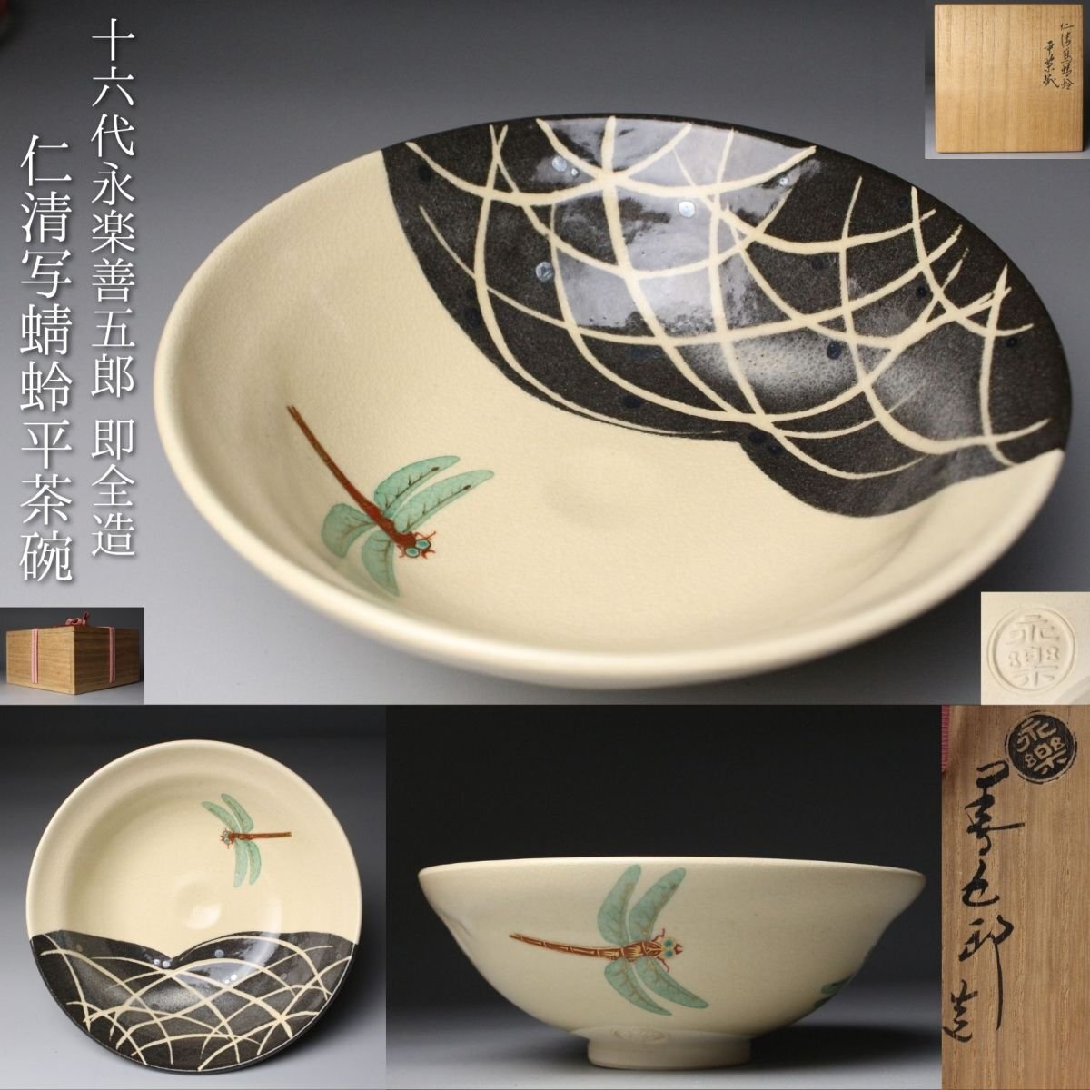 > 【LIG】真作保証 十六代永楽善五郎 即全造 仁清写蜻蛉平茶碗 共箱 茶道具 旧家収蔵品[.RP]25.11