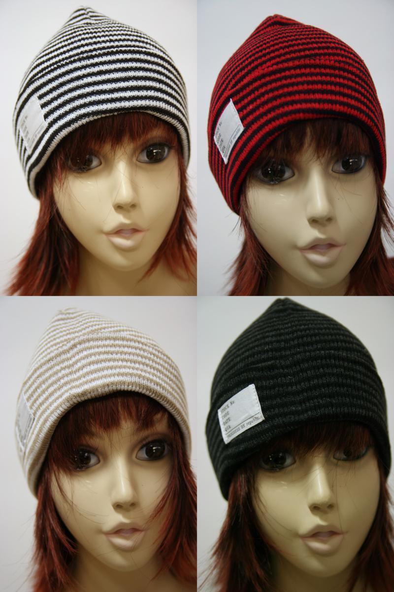 > 送料無料◆4色組◆通年タイプ◆フリーサイズ◆男女兼用◆コットン75%配合◆綿混ボーダー柄ニット帽(ホワイト&レッド&ベージュ&ブラック)
