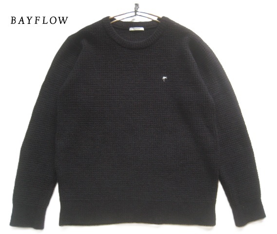 > 美品!!ベイフロー BAYFLOW*ヤシの木刺繍 クルーネック ワッフル織り ポリコットンニットセーター 2 実寸S 黒 ブラック 海上がりに着たい