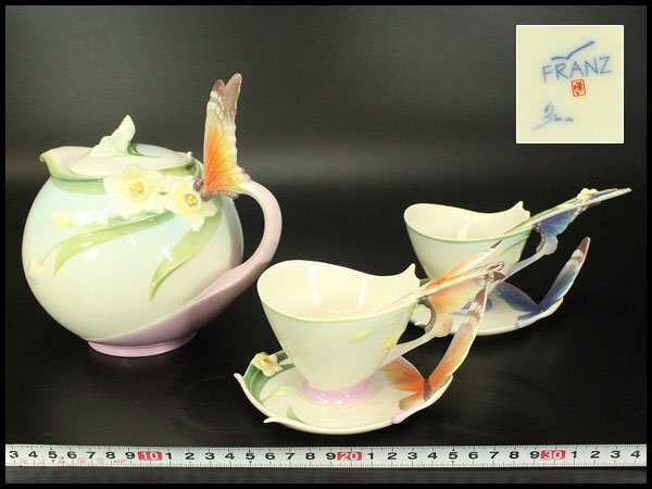 > 【銀閣】高級陶器 FRANZ PORECELAIN COLLECTON 蝶 ティーポット カップ 三点 まとめて 旧家蔵出 送料無料(A184)